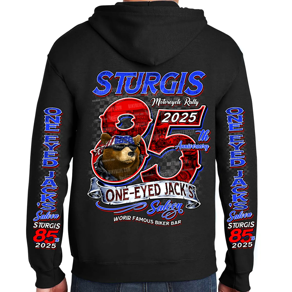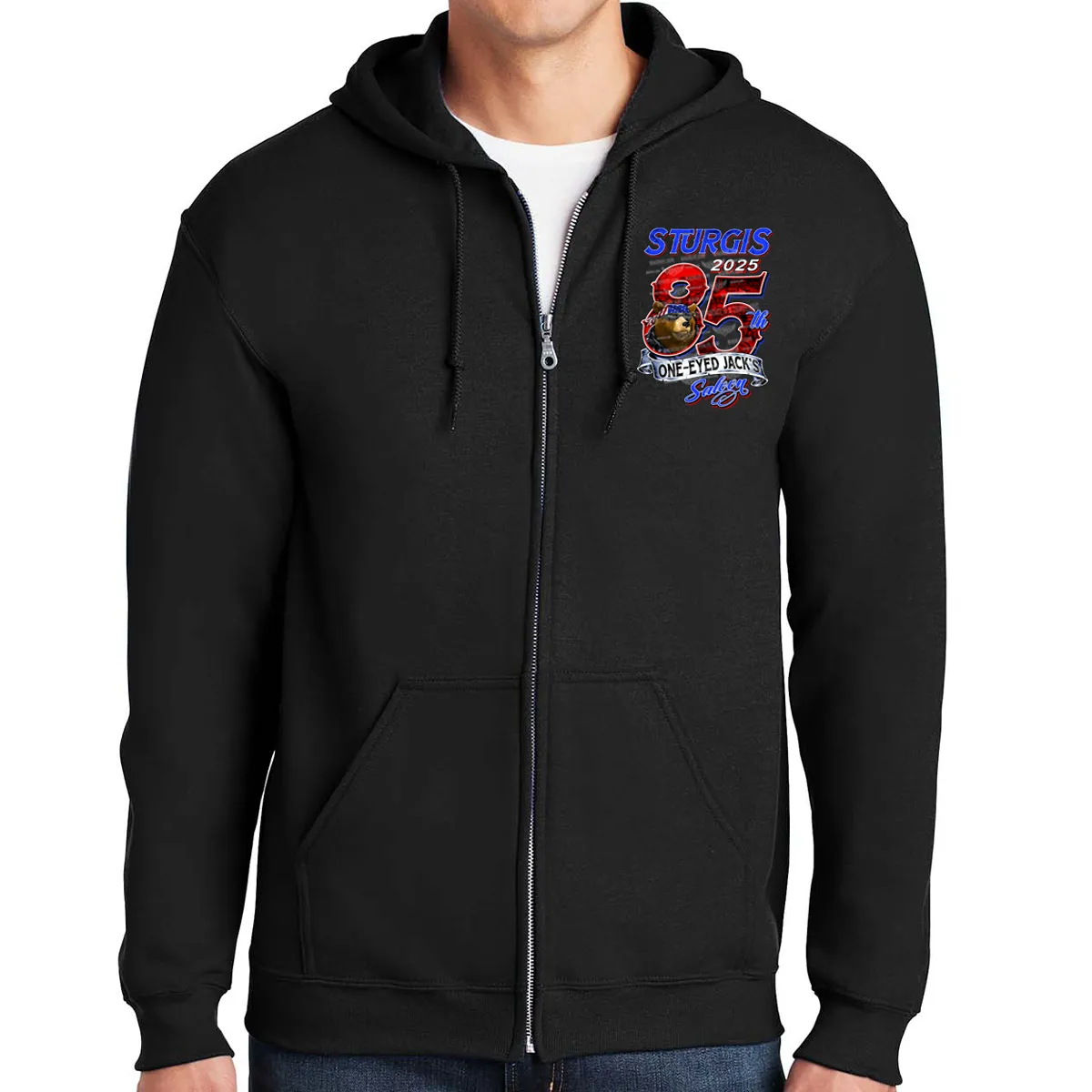 SPECIAL EDITION 2025 Sturgis Motorcycle Rally One Eyed Jack’s Saloon Big 85th Black Zip-up Hoodie LDLO14052525
